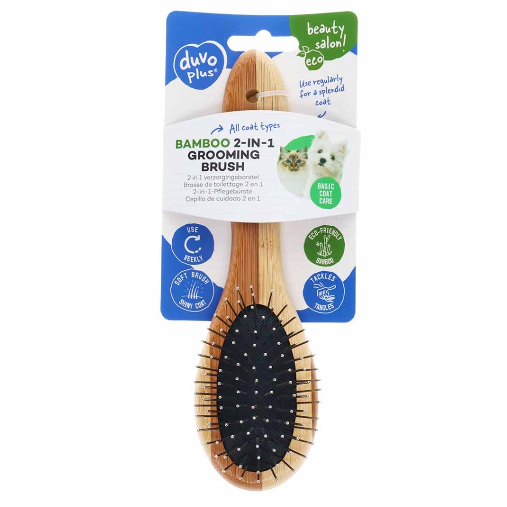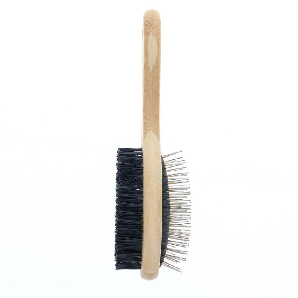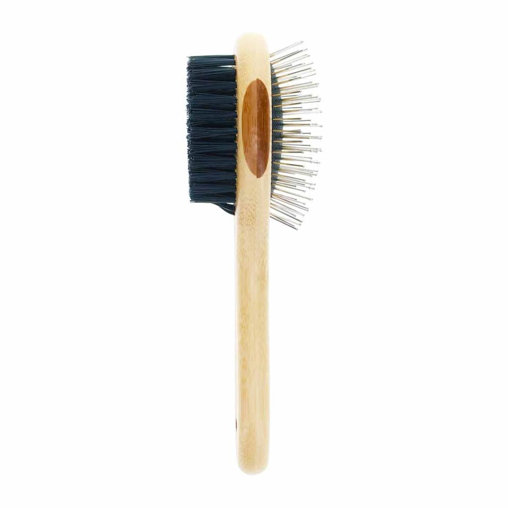 Jedna strana četke ima tanke metalne iglice koje efikasno uklanjaju otpalu dlaku i nečistoće, dok druga, mekana najlonska strana, polira i čini krzno svilenkastim i sjajnim. Zahvaljujući ergonomskoj dršci od ekološki prihvatljivog bambusa, četka savršeno leži u ruci i omogućava stabilan hvat tokom upotrebe. Dimenzije 23x7cm čine je idealnom za srednje i veće pse i mačke svih tipova dlake.