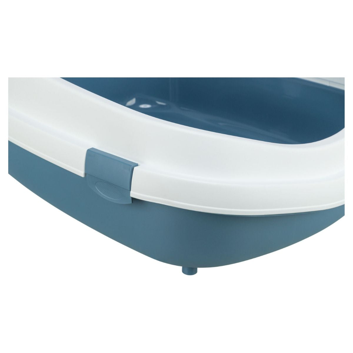 Opremljen je širokim obodom pričvršćenim plastičnim rezama koji sprečava rasipanje peska i tečnosti, čime se održava čistoća oko toaleta. Gumirane noge obezbeđuju stabilnost i sprečavaju klizanje, čak i na glatkim podlogama. Duboka posuda sa zaobljenim ivicama sprečava izlivanje i pruža dodatnu sigurnost tokom korišćenja. Elegantna kombinacija plave i bele boje čini ga atraktivnim dodatkom svakom enterijeru.